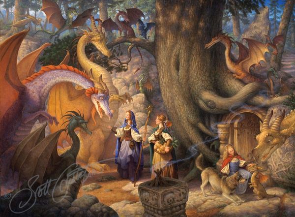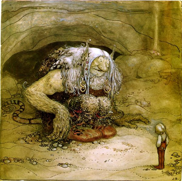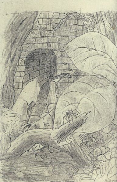 Curator: Theodor Kittelsen’s 1892 work, simply titled "Dragon", presents quite the scene. It looks to be crafted using coloured pencils and perhaps some watercolor as well. Editor: My first thought? Melancholy. There's this beautiful, muted palette and that very still, almost lifeless dragon at the center. The contrast with the chests filled with gold is certainly striking. Curator: Yes, that tension is certainly part of its power. Consider the dragon itself – likely born from some blend of artistic imagination mixed with Nordic folklore, but rendered in what appears to be simple pencil strokes on paper. This work lives within the late 19th-century vogue for revisiting national myths, reinterpreting them with newly available industrial pigments that lent brightness and subtlety to colour rendering. Editor: The positioning is so interesting too. Notice how the artist plays with light and shadow, almost staging a miniature theatre? The dark cave and dragon on the left pull us in, and then the eye is drawn toward the skull in the lower right—a stark contrast against the chests filled with precious things. The dragon skeleton appears a little like still life with landscape as theatre set design. Curator: Exactly. How does the death of the dragon become something consumable through painting? It touches on issues of class, power, and labor. Are we, as viewers, implicated in some dragon-slaying narrative through the act of spectating its death, in accessing its stolen treasure? Editor: That connects interestingly with romanticism. The artist frames the quiet death of a monster, the fading of some terrifying element into art itself. The use of such muted and refined art materials like watercolours and coloured pencil contrasts violently with our idea of the dragon. Curator: Precisely. So the tension, for me, arises from the labour put into producing the physical art and how the scene and the dragon came into being at the hand of an artist at the turn of the century. Editor: I think the artist cleverly used the composition and colors, and combined different symbolic pieces to draw viewers in, provoking curiosity and, yes, making you contemplate the transient nature of life. Curator: Well said, it shows how art is always intertwined with societal and material questions, not purely an abstract expression. Editor: Right back at you; observing such arrangements—a skull there, two treasure chests behind—reveal much about the artistic intent.