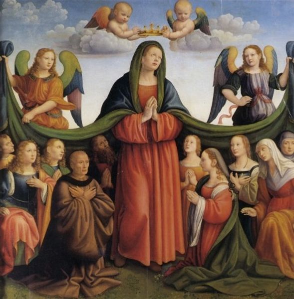 Pietro Perugino created this large altarpiece painting with oil on panel in Florence. The painting is oil on wood, a shift away from earlier fresco techniques. This change allowed for richer colors and greater detail, but also required a complex understanding of layering and drying times. The vibrant blues, reds, and golds weren’t just aesthetic choices, they were the product of extensive labor and expensive pigments, reflecting Perugino’s mastery and the patronage of the Vallombrosa abbey. Note the smooth finish and the soft gradations of light and shadow. These qualities are testament to Perugino's skill in manipulating the oil paint, building up thin layers to create a luminous effect. Think about the labor involved in grinding pigments, preparing the wood panel, and meticulously applying each brushstroke. This isn’t just a devotional image, it's a product of skilled craftsmanship and economic investment. The materials and processes used in this artwork speak to the intersection of artistic skill, economic resources, and religious devotion in Renaissance Italy.