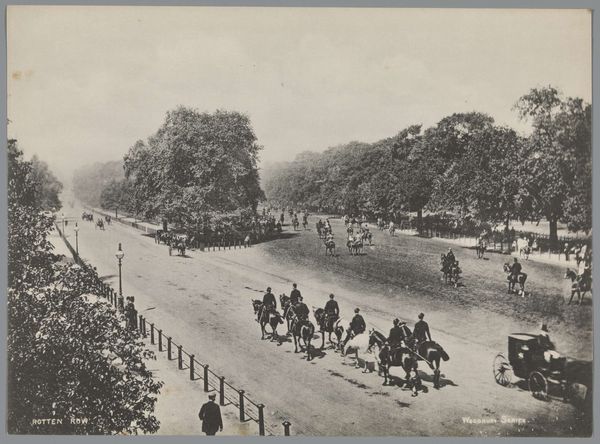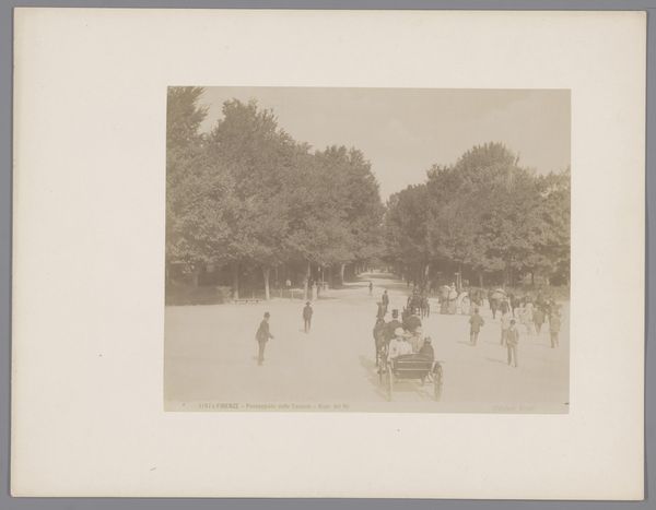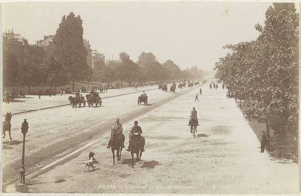 Curator: This gelatin silver print captures a bustling scene from the Avenue des Champs-Élysées in Paris, circa 1880 to 1900, snapped by an anonymous photographer known only as X. phot. Editor: It has this dreamlike quality, almost hazy, with muted tones emphasizing the broad avenue disappearing into the distance. It feels stately, but also fleeting. Curator: Absolutely, the atmospheric perspective pulls us into the heart of Parisian life, doesn't it? Note how the light catches the architecture in the background—it really highlights the enduring monumentality. We're clearly in an era defined by progress and pomp. The presence of the horse-drawn carriages speaks to social class. Editor: It's amazing how much is captured within this singular monochromatic process! Gelatin silver prints allowed for mass production, contributing to widespread consumption of images and ideas of city life like never before. Imagine the labour behind each one of those images being reproduced! Curator: Indeed. The printing process facilitated the widespread circulation of such urban representations, reinforcing ideas about modernity and progress, but consider, too, the symbolism embedded in this visual documentation. The avenue represents a deliberate arrangement of the city, controlled and rational, revealing how urban planning becomes an expression of political power. Editor: A completely artificial nature; carefully placed trees framing the monument and obscuring anything considered "undesirable", certainly! Do you think the material quality here contributes to our interpretation of realism versus idealized propaganda of empire? Curator: The tonal range gives depth. This makes me think more of how this type of urban staging presents a specific fantasy, an ideal. A dream, even, as we think about Japonisme influencing art with framing that suggests the city is more of a set than reality. Editor: Interesting thought. This single photograph can unpack layers of meaning about class, labour and empire…a little bit different from simply strolling down the Champs-Élysées today, eh? Curator: Indeed. The symbolic weight here is fascinating. Editor: Seeing the photograph helps ground those abstractions and connects us to a specific place and moment in time.