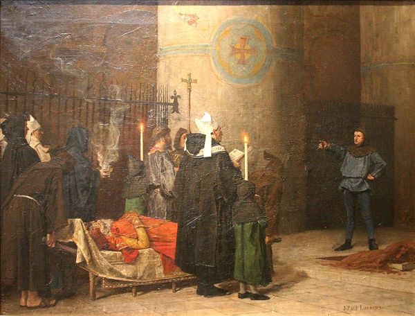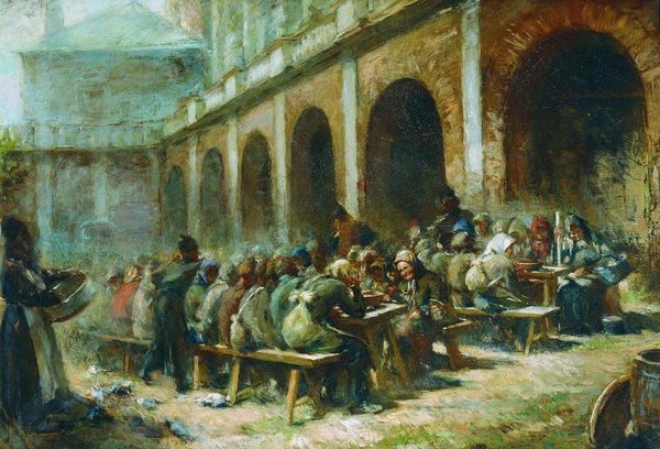 Curator: Editor: Here we have John Singer Sargent's "Hospital at Granada," painted in 1912. It's an oil painting, depicting what appears to be a courtyard filled with people, likely patients. There's something so heavy and… well, institutional, about the way the light falls on the scene. What stands out to you? Curator: Immediately, the painting calls to mind questions of production and social class. Consider the materials themselves – oil paint, canvas – and the labour required to extract, manufacture, and then transform them into an artwork. What class of people are we seeing and are their portraits celebrating or demeaning their positions? Who had the luxury to consume an image of that landscape and for what use? Editor: That's an interesting perspective! I hadn't thought about the act of viewing and owning this piece itself as part of the social context. But given that it's Sargent, shouldn’t we consider that this could also be interpreted as a ‘genre painting’—as a window into this specific place in time? Curator: Precisely, a carefully constructed ‘window’. How are these patients represented and how does the mode of representation itself reinforce power dynamics between the artist, his patrons, and his subjects? The act of painting them elevates it, turning working class lives into high art, ready for consumption by the elite. What impact does that commodification of experience have, and how is it reflected materially in the choices Sargent makes in its production? Editor: So you are saying that by focusing on the 'means' rather than 'ends,' we find social dynamics at play? Curator: Absolutely. By examining labor, the value assigned to different types of materials and artistic skill, we reveal who is involved, their positions, and the relationship between artist and the represented, blurring traditional boundaries and providing insights into art, culture, and capitalistic value systems. Editor: Okay, that gives me a completely different perspective on this piece and I realize there is so much more at play beyond its surface. Curator: Indeed, shifting our focus to its materials helps illuminate those hidden aspects of its world and it’s one mode for art analysis.