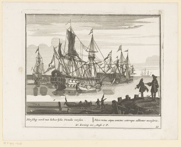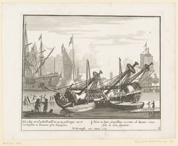 Editor: Here we have "Opbouw van een schip," or "Construction of a Ship," an engraving from between 1717 and 1732, attributed to Pieter van den Berge. The level of detail is quite remarkable. What strikes me is the contrast between the stillness of the water and the implied flurry of activity in the shipyard. What do you see when you look at this print? Curator: It whispers tales of Dutch ambition, doesn't it? Look closely, and you’ll notice this isn’t just shipbuilding; it’s nation-building. Each timber, each meticulously etched line speaks of global trade, naval power… adventure! It's as though van den Berge wanted to capture the very moment when a nation’s dreams take shape. The inclusion of the cityscape makes me think of the Dutch Golden Age where land and sea were equally important to those in the Netherlands. Do you get a sense of that at all? Editor: Definitely! It's like a celebration of industry and ingenuity, with the cityscape as a constant reminder of what all this hard work is *for*. The detailed linework almost feels architectural. Curator: Exactly! The engraving feels like a carefully drawn blueprint *and* a piece of art. Note also the text inscribed. So even at the time of making the artwork, Pieter felt he had something very specific to show, some information to divulge. The scale of everything! Even the clouds overhead seem to hold their breath, as if in awe of human innovation! And this print ensured its legacy endures! Editor: So it is at once visually striking and packed with symbolic value. Curator: It reminds us that art can be a potent document. Who knew a simple engraving could say so much about the Dutch Golden Age. Thanks, Pieter!