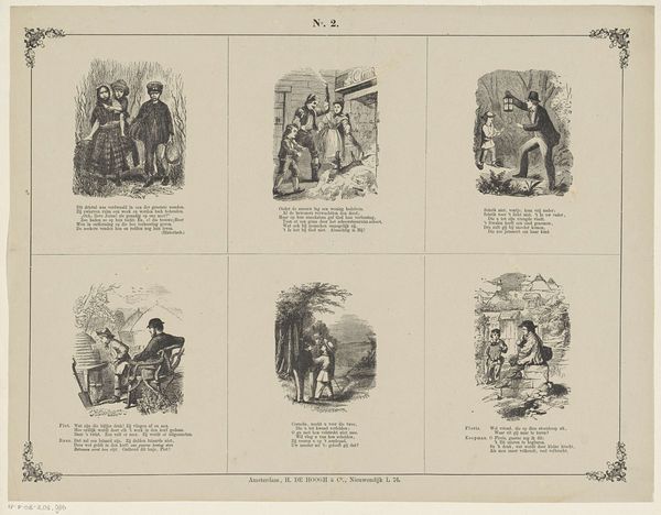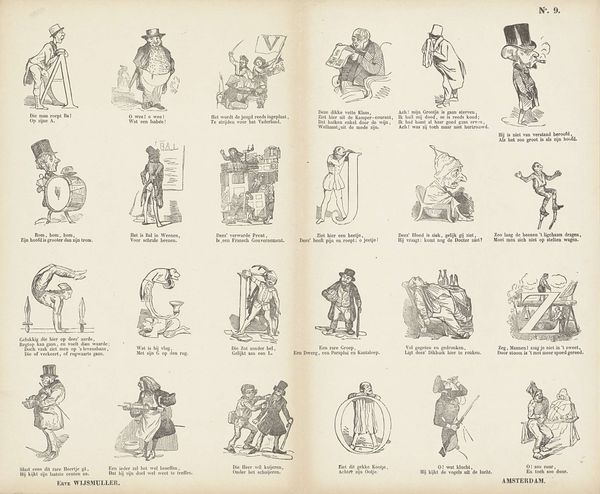 This print by Erve Wijsmuller presents a series of miniature scenes rendered through engraving, a technique involving carving lines into a metal plate to hold ink. Engraving was essential for mass-producing images before photography, making it an important tool for circulating ideas and shaping public opinion. The fine lines and meticulous detail reflect the skilled labor required to create the printing plate. The scenes themselves depict various aspects of everyday life, hinting at the diverse social classes and activities within Amsterdam society. These vignettes, captured through the repeatable process of printmaking, speak to broader themes of labor, leisure, and the social fabric. The very act of creating and distributing these images through print highlights the intersection of art, commerce, and social commentary, underscoring the role of craft in shaping cultural narratives. The artwork challenges traditional distinctions between fine art and craft, emphasizing the importance of materials, making, and context.