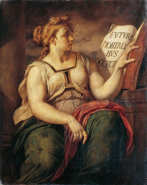 Curator: This is Orazio Gentileschi's "A Sibyl," painted in 1638. An intriguing blend of portraiture and historical allegory, wouldn’t you agree? Editor: Immediately I see solemnity. She’s beautiful, but preoccupied, staring off with that almost anxious brow... Like she knows too much, which, as a Sibyl, she probably did. I feel like I'm catching her in a private moment of prophetic anxiety. Curator: The canvas gives insight into Gentileschi's methodical technique. Note how the materials—oil paint, canvas, pigment choices—contribute to a luxurious yet subdued effect, particularly evident in the draping fabrics. Also, consider the socioeconomic factors involved in acquiring such materials. The very act of producing the art necessitates economic exchange. Editor: I love the way that ochre and pink create these warm skin tones, making the chill of her prophecy somewhat approachable. Also, look at that strange script she’s holding! It feels so…unreadable, secretive. You know, it makes you wonder what's going to be our ruin. Curator: The choice to represent a Sibyl as both a historical figure and an object of beauty is very telling. In this academic Baroque style, the artist blurs the lines between mere craft and artistic mastery. Her direct connection to patronage is also quite striking, demonstrating that artistic creation rarely existed in a vacuum. Editor: There's something really tragic in how he makes her look both ethereal and… ordinary. It almost suggests anyone could be a vessel of the divine. What if we are all holding incomprehensible scrolls? A disturbing and delightful thought! Curator: Exactly. It reveals not only Gentileschi's technical prowess but also broader questions around how such skills were financed and consumed in the social hierarchies of the 17th century. Editor: Her intensity will sit with me. The way she looks away suggests infinite awareness, burdened and brave. Curator: A fitting summation. A testament, ultimately, to how even personal interpretations are influenced by historical context.