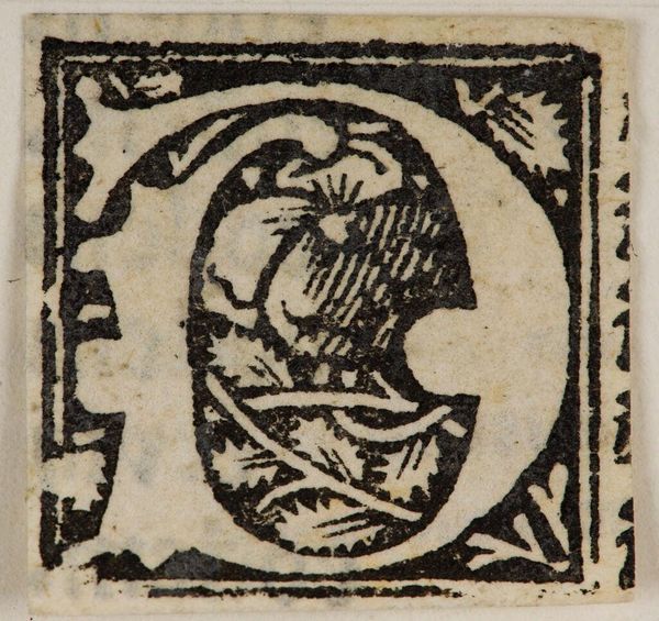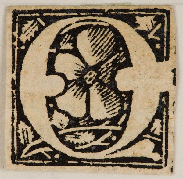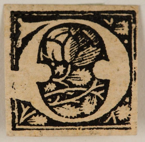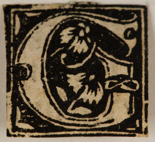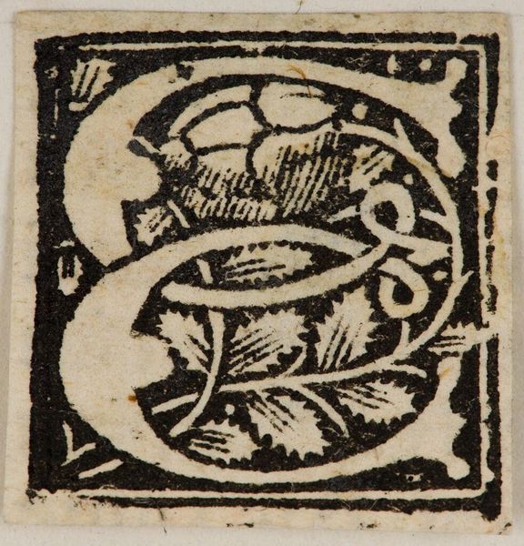 Curator: This small woodcut, titled "Initial C," comes to us anonymously. It resides here at the Harvard Art Museums. Editor: The boldness of the black ink against the stark white makes this seem remarkably modern, almost like a protest sign. Curator: Initial letters like these were commonly used to embellish illuminated manuscripts, each carrying symbolic weight depending on the text they prefaced. Editor: It's interesting to imagine who created this—a monk? A woman? What beliefs were they trying to communicate, if any, through this "C"? Curator: Precisely. Perhaps the floral motifs interwoven with the letter hinted at themes of creation, cyclical renewal, or even resurrection? Editor: Or maybe it’s an assertion of power—the initial for a patron’s name, a visual signifier of status amidst social hierarchies of wealth and knowledge. Curator: I find myself pondering on how a single letter can be so much more than just a linguistic marker. Editor: And I'm left wondering about all the untold stories it could tell us about the social conditions of its creation.