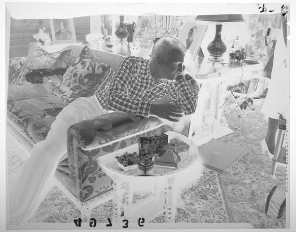 Curator: This intriguing photograph, simply titled "Untitled (woman wearing hat with horns on it)" comes from Peter James Studio, though its date is unknown. Editor: It has a rather unsettling yet playful quality, doesn't it? The inverted tones give it a dreamlike feel, while the horns... certainly grab your attention. Curator: Indeed. The gelatin silver print, measuring roughly 5x4 inches, presents a fascinating look at the cultural dynamics surrounding studio portraiture. Editor: The horns, juxtaposed with the woman's seemingly ordinary office setting, create a powerful visual tension. Perhaps a commentary on societal expectations versus personal desires? The horns symbolize a rebellious spirit. Curator: Or could it be a lighthearted commentary on female power, playing with the symbolism of the "devilish" woman that has been historically exploited? Editor: Interesting point. It's as though she's subverting that very symbolism. I find myself pondering the stories behind her pose and expression. Curator: Absolutely. The seemingly simple composition invites questions about identity and societal roles in the mid-20th century. Editor: After my initial visceral response, I'm now appreciating its clever commentary on identity. Thank you for showing me the material context.