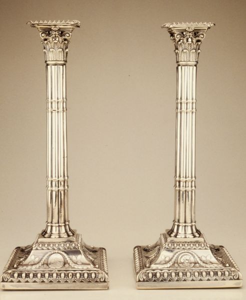 Curator: Well, aren't these little guys just radiant? Editor: Indeed. These Rococo-style candlesticks, dating back to around 1780, are quite captivating. Crafted from brass and metal, they present a striking aesthetic from an anonymous artist, don’t you think? Curator: Anonymous, always the mysterious artist. I can see the glimmer and the Baroque flamboyance, everything shimmering. These candlesticks have such a lively, golden allure, they could light up anyone's heart! Editor: Yes, it is an exemplary Rococo exuberance. Let us analyze its components further. The composition is intensely vertical. There's this upward surge, culminating in the crowning receptacle. The golden hue seems to almost liquefy the sculpture, softening its contours and hinting at immateriality. Curator: Liquefying...yes! It’s as if these aren’t mere candlesticks but vessels filled with golden daydreams! I wonder about the craftsman, lost to history but leaving us these glimmers. Editor: I appreciate your romanticism, but to remain semiotically aware, the anonymous figure allows the form to speak with more clarity. See the floral motifs on the base that transition smoothly, harmoniously toward cherubic figures as we progress up the vertical structure. Each aspect serves as an expression within a shared language. Curator: Semiotics, a language understood only by candlesticks perhaps? For me, this period tells stories, they tell tales of feasts, secret rendezvous, perhaps stolen moments under candlelight. Editor: Stolen moments—yes, very telling. Such decorative objects underscore not merely aesthetic but practical consideration, a conduit to manipulate shadow, emotion and perception itself. Curator: In a way, these shiny marvels serve as an intriguing mirror, showing us beauty and our connection to times past. They take me somewhere beautiful and bygone. Editor: Agreed, even without the name to attach, these are exemplary works.