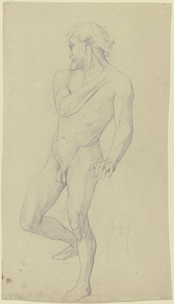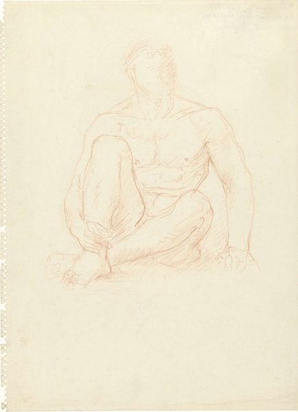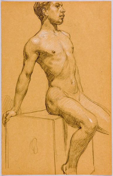Curator: Before us we have "Seated Male Nude with Left Arm Resting on Left Knee," a drawing by Frank Samuel Eastman, held at the Harvard Art Museums. It measures about 53 by 33 centimeters. Editor: It's a fairly academic sketch, isn't it? The kind of thing intended to train the eye and hand. I’m drawn to the texture of the paper itself and how it interacts with the graphite. Curator: Eastman, like many artists, engaged with the tradition of life drawing. These studies weren't just about rendering the body; they were exercises in understanding form, light, and shadow—essential skills for crafting narratives and representing the human condition. Editor: Absolutely. And the choice of paper, the pencil's hardness, even the angle of the light in the studio all impacted the final product, didn't they? These materials defined the parameters of the practice, and consequently, of what could be visually and culturally communicated. Curator: Precisely. Examining the finished sketch in terms of art education tells us a lot about the art of the time. Editor: It gives us insight into the studio practices and artistic values of the period.