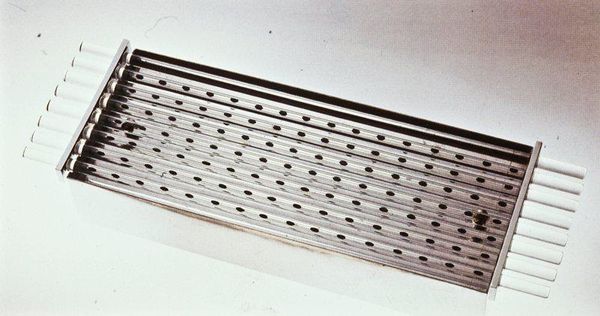 Editor: Here we have an ice bucket with cover, made around 1937. It seems to be composed of metal and glass, showcasing a streamlined geometric design. Its subdued palette and severe right angles give off a distinctly cold feel. What do you see in this piece, stylistically? Curator: The object presents a fascinating study in pure form. Observe how the designer emphasizes geometric clarity. The cube is, of course, primary, echoed in the square lid and subtly reiterated in the handle's rectangular form. Editor: The geometry feels so rigid. Almost…dehumanizing? Curator: That is precisely the tension this piece negotiates. Note the absence of ornamentation, a hallmark of its period. We find only essentialized shapes, the structure rendered visible. Does the material contrast--the opaque glass playing off the sheen of the metal--speak to you? Editor: Yes, definitely. There's something elegant about the simplicity and material contrast that catches the eye. But in an understated way. Curator: Indeed. It asks us to consider the essential characteristics of both materials, juxtaposing their intrinsic qualities in service of pure aesthetic form. It begs the question, can utility also achieve high art through a reduction to bare structure? Editor: So, stripping down an object to its core geometrical form and materials elevates it. Curator: Precisely! Deconstruction leading to purity. It is truly a rewarding composition when perceived within a system. Editor: I never thought I'd find an ice bucket so intellectually stimulating! I’ll look at art deco design with new eyes now.