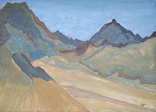 Editor: Here we have Nicholas Roerich’s 1926 oil painting, "Sandoling. Lamayura." The reddish-brown landscape and tightly packed buildings create an enclosed, almost secretive atmosphere. What can you tell me about this piece? Curator: Roerich often embedded profound spiritual meanings within his landscapes. Note how the architectural forms nestled between the mountains seem to mimic the shapes of the peaks themselves. Do you think that's intentional? Editor: It certainly seems that way! Is there a symbolic connection being made between humanity and nature here? Curator: Absolutely! The painting might evoke the concept of 'Shambala', a sacred place of peace and enlightenment. The arch could be understood as a gate to a different spiritual plane, framed by mountains that are laden with spiritual symbolism. Notice how the arch appears in many of his Himalayan paintings; to me, it implies the human aspiration to transcend material reality. What emotional response does the painting evoke in you? Editor: A sense of yearning, I think – a desire for connection to something larger than myself. The way the colors blend and the forms echo one another adds to that feeling of seeking harmony. Curator: The harmony you speak of could extend to Roerich’s vision of unity, peace, and the interconnectedness of cultures. He infused this work with symbols to inspire cultural memory and, perhaps, an optimistic future. Editor: So, what I initially saw as just a landscape is actually a rich tapestry of cultural and spiritual symbolism. I’ll never look at mountains the same way again!
