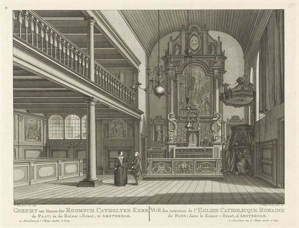 Editor: Here we have "Interior of the Roman Catholic Church on Boommarkt in Amsterdam" from 1769 by Caspar Jacobsz. Philips, created as an engraving. It's interesting how detailed the artist made the interior, even with the limitations of the print medium. I'm curious, what stands out to you in this piece? Curator: What immediately grabs me is the context of a "hidden church." This engraving documents a Catholic church operating discreetly in 18th-century Amsterdam, a period and place where religious freedoms were curtailed. How does this visual representation, in your opinion, challenge or subvert the dominant narrative of the time? Editor: Well, showing the opulence of the interior feels like a quiet act of defiance. The details, like the organ and the statues, suggest a community that refuses to be invisible, even if they are practicing in secret. Curator: Exactly. It is resistance through beauty, wouldn't you say? Philips documents this clandestine space, revealing the complexities of identity and belief in a society grappling with shifting power dynamics. Look at the people depicted – are they merely observers, or are they active participants in this act of preservation? Editor: That's a great point. They almost seem to be inviting us, the viewers, into their secret. By creating this artwork, Philips makes the invisible, visible. Curator: Indeed. And how does that relate to current debates about representation and marginalized voices in art and society? Editor: It reminds me that even subtle acts of documentation can have profound impacts on how we understand history and advocate for inclusivity today. I'm going to rethink what it meant to be visible in that time, and how artists helped in reshaping society's views. Curator: Precisely. And hopefully, consider how we participate in similar reshaping now.