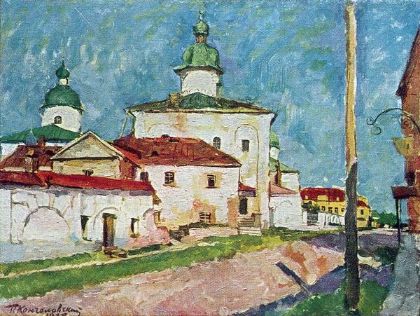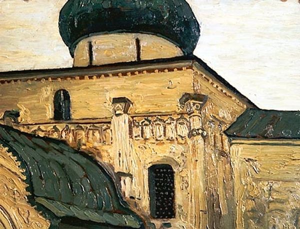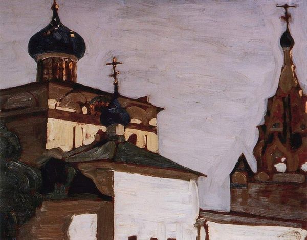 Curator: Gazing at Nicholas Roerich’s “Putivl” from 1908, the first thing that hits me is this dreamy, almost ethereal quality. It feels like a scene remembered rather than simply observed. What jumps out at you? Editor: It’s certainly striking how he reduces architecture to these simplified, almost geometric forms. It's like a stage set, all clean lines and soft pastels under that bright sky. Curator: Exactly! Roerich often drew from medieval Russia, seeking a spiritual and cultural rebirth. You see it in his sets and costumes for Diaghilev’s Ballets Russes, and you feel that echo here. The architectural forms speak to the monumental spirit of early Russian cities. Editor: It’s interesting to see that medieval influence being embraced alongside the burgeoning Russian Avant-Garde. "Putivl" feels a bit like stepping into a folk tale. Does the specific history of Putivl feed into this vision at all? Curator: Absolutely. Putivl, now in Ukraine, held deep symbolic importance in Russian history, especially through the epic poem "The Tale of Igor's Campaign," which speaks of valor and unity. Roerich painted many scenes like this. "Guests from Overseas", "City in Construction," they’re all these evocations of a mythic, national past. Editor: It's interesting how Roerich paints these old towns as not really populated by people, or contemporary ones anyhow. Is this idealized nostalgia then, or is he finding something more perennial in the stones themselves? Curator: I see it more as Roerich looking *through* the historical narrative, searching for something transcendent and enduring in the cultural memory. It’s as if he believed that these places held the soul of Russia itself. He often infused Theosophical beliefs into his art. So his landscapes and cityscapes were attempts to visually materialize the past while gesturing towards a spiritual future. Editor: So, in the end, is "Putivl" a historical depiction or a sort of painted aspiration? Curator: Perhaps it's that delicate balance between a longing for the past and a reaching towards the future, captured in these softened edges and luminous skies. Editor: A painted reverie. Makes you wonder what future artists will dream up about our own time.