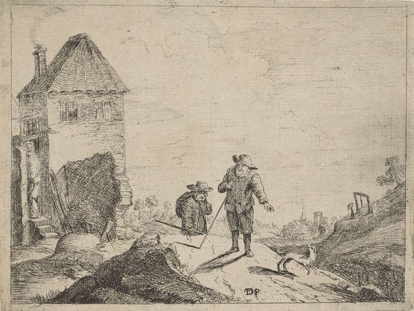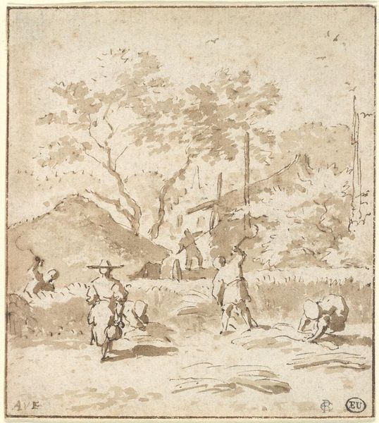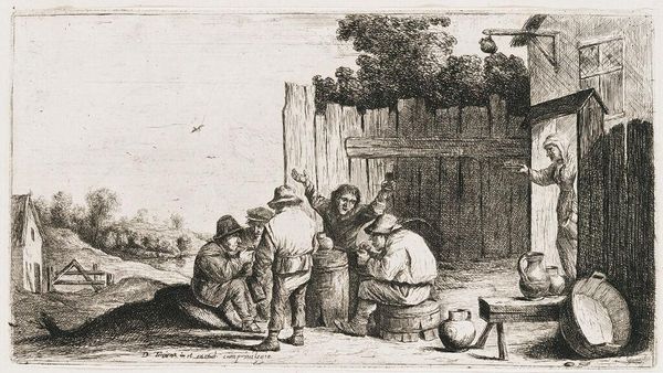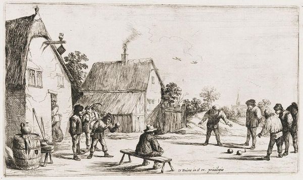 Editor: This etching, called "Archers," is by an anonymous artist and is part of the Harvard Art Museums collection. It depicts a group of people practicing archery, but there's a somber mood to it despite the activity. What strikes you about this piece? Curator: This image raises interesting questions about social class and leisure. Archery, traditionally associated with military prowess and hunting, became increasingly formalized as a pastime. How might the artist be commenting on the accessibility, or lack thereof, of such leisure activities across different social strata? Editor: So, you're thinking about who gets to participate in activities like this, and what that says about society at the time? Curator: Precisely. Consider the setting: a rural landscape, modest buildings. Is this a scene of inclusivity, or a pointed observation about the privileges afforded to some and not others? Editor: That definitely gives me a new perspective on it. I was just seeing it as a historical snapshot. Curator: Art can serve as a powerful lens through which to examine and critique social structures. This piece invites us to consider who is included, who is excluded, and what power dynamics are at play. Editor: I’ll never look at archery the same way again!