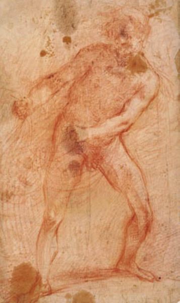 Vincenzo Dandini made this red chalk drawing of a kneeling male nude in the 17th century. Chalk is interesting stuff: it’s soft, easily powdered, and made from sedimentary rock, formed from the shells of marine organisms that lived millions of years ago. Dandini has used this humble material to achieve a delicate, almost ethereal effect. The powdery quality of the chalk allows him to build up subtle gradations of tone, suggesting the play of light across the figure's body. Look closely, and you can see how the artist has exploited the chalk's tendency to smudge, blurring the edges of the form and creating a sense of movement. The choice of red chalk, or sanguine, is also significant. This pigment has been used by artists for centuries to depict the human form, its warm, earthy tone lending a sense of life and vitality. Dandini skillfully exploits these qualities, creating a drawing that is both technically accomplished and emotionally evocative. Ultimately, understanding the materiality of this work—the qualities of chalk itself—adds to our appreciation.