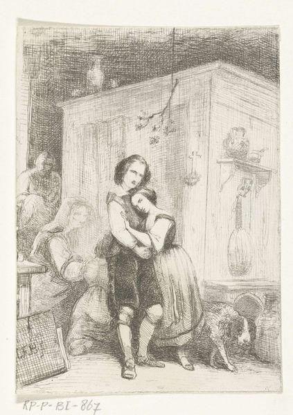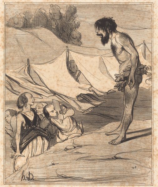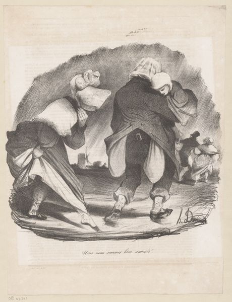 Honoré Daumier made this lithograph, titled ‘Le premier bain,’ which translates to ‘The First Bath,’ using a greasy crayon to draw directly onto a prepared limestone slab, before printing it onto paper. The visual impact hinges on the immediacy and expressive quality of the lithographic mark. Daumier masterfully captures the scene's energy and emotion, from the father's straining posture to the child's wide-eyed trepidation. Lithography allowed for relatively quick reproduction, making Daumier’s social commentary accessible to a wide audience. As a printmaker, Daumier sat outside the traditional hierarchy of painting and sculpture. His images circulated in newspapers, offering sharp commentary on the lives of ordinary people in the rapidly changing urban landscape of 19th-century Paris. This print, with its focus on a simple, intimate moment, reflects Daumier’s interest in the everyday experiences of the working class. It reminds us that artistic value lies not just in the choice of subject matter, but in the skill and insight brought to its depiction.