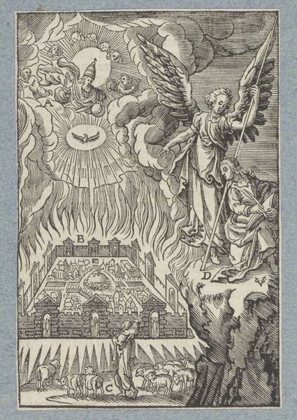Editor: This engraving, "Sudarium Spread Out By An Angel" by Albrecht Dürer, made in 1516, has an ethereal, almost dreamlike quality. The density of the linework creates such a dark, dramatic scene. What strikes you most about this work? Curator: I see layers upon layers of meaning embedded in Dürer’s visual vocabulary. The Sudarium, also known as the Veil of Veronica, is not merely a cloth; it’s a powerful relic believed to bear the true image of Christ. Notice how the angel presents it. It’s a gesture of unveiling, of revealing truth. Editor: So the angel isn't just showing the cloth, it's more like presenting an important symbol? Curator: Precisely! And consider the historical context. Dürer was working during a time of immense religious upheaval with the Reformation brewing. The image carries the weight of tradition. Consider also the medium—engraving—a meticulous, time-consuming process. Doesn’t that devotion mirror the reverence for the sacred image itself? What emotions does that dense linework evoke for you? Editor: I get a sense of solemnity. The intricate detail, almost obsessive, reinforces the sacred nature of the subject, but with such visual texture it could equally be showing turmoil. It makes you really consider what is behind the action shown, and to keep considering what you thought. Curator: Absolutely. Dürer uses the symbols of his time and layers on details, creating new questions that ripple through time and make us reconsider the narrative. Do you think the symbols shown affect you differently now compared to the 16th century? Editor: Yes, without an understanding of those symbols now, the work appears initially as quite a chaotic and crowded scene. Knowing more gives it focus and deepens the emotional resonance. Curator: Indeed. That is the wonderful quality of artwork and their symbolism; the ability to continually challenge us to learn more and think differently through time.