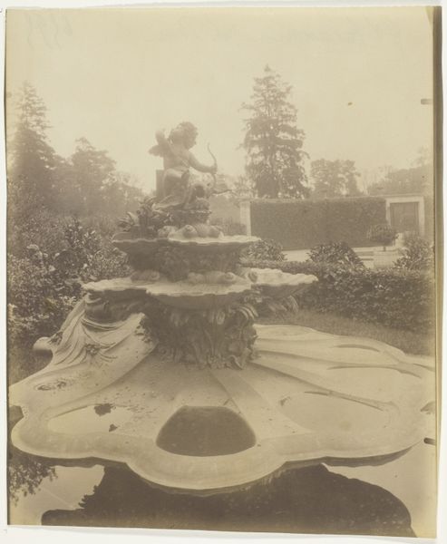 Editor: This photograph, “Vijver met fontein en eenden in een tuin” taken by Richard Tepe between 1900 and 1930, captures a fountain in a garden. It has a somewhat dreamlike quality, partly due to the tonal range of the sepia. How do you interpret this work? Curator: Well, let's start with the materiality. It's a photograph, so we have to think about the chemistry involved in creating this image. What kind of paper was used? How long was the exposure time? Those things shape our understanding of what we're seeing. What can you tell me about the process involved in photography at this time? Editor: I understand photography from this era could be manipulated, it's interesting to consider how those choices may have informed the final result. But more than that, is it meant to depict reality? Curator: Exactly! And what kind of reality? This scene presents an idealized version of leisure, doesn’t it? The manicured garden, the fountain, the ducks – they all speak to a certain social class and access to resources. Think about the labour required to maintain this kind of space. How does that inform the overall image? Editor: I see your point. It's not just a pretty picture, it’s representative of its context, alluding to a stratified society, and an ideal produced by consumption. Is it a commentary? Curator: Perhaps not an overt one. But by understanding the material conditions of its creation, and the social context in which it was produced and consumed, we gain a much richer understanding of what the photograph communicates. Don't you agree? Editor: I do! Seeing it this way emphasizes what's present and absent in the image, layering the photographic process, the setting and period on top of my first impressions. Thanks for offering this perspective.