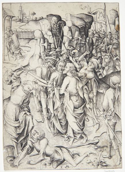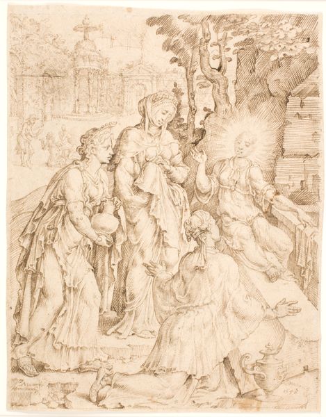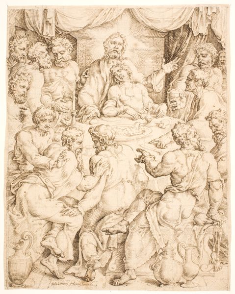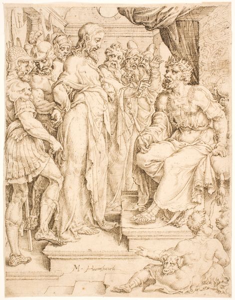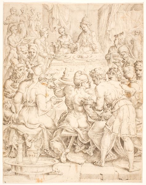 This is Maarten van Heemskerck’s ‘Christ washing the Apostles’ feet’, a drawing made with pen and brown ink. The composition immediately strikes you with its dense arrangement of figures. Heemskerck uses line work to build form and create depth, but also to suggest the emotional tension of the scene. The architecture is meticulously rendered, yet it’s the figures that dominate. Note how Christ kneels humbly, a stark contrast to the elevated stage where others observe, creating a visual hierarchy that speaks to the subversion of power. The texture of the drawing, achieved through the cross-hatching and varied line weights, adds a tactile quality to the divine act. Heemskerck uses the semiotic language of the body to convey meaning. The focused gaze, gentle touch, and yielding posture create a narrative charged with humility and service. This isn't just a biblical scene; it’s an exercise in the aesthetics of human interaction.