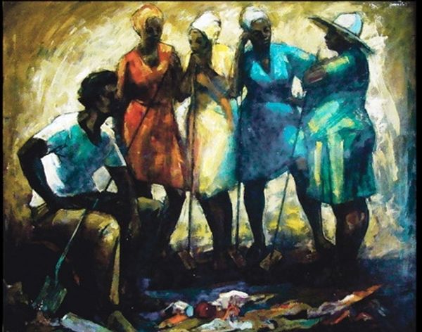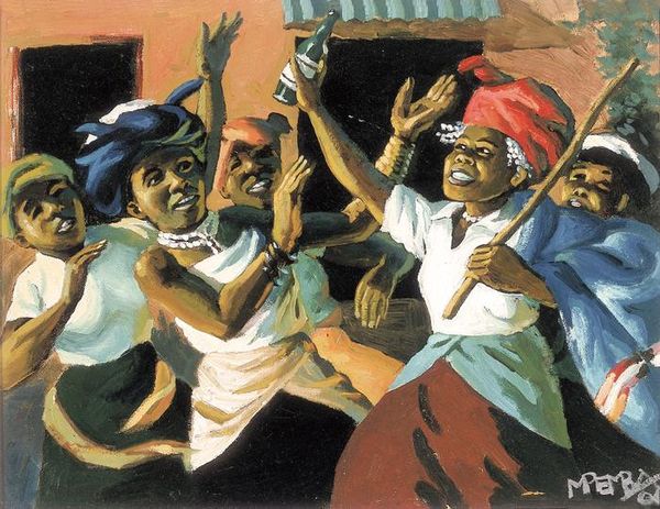 Curator: Looking at this oil on canvas titled "The Audience," created by George Pemba in 1960, what's your initial response? Editor: Intimacy in public. That’s what jumps out. I get the feeling I’m intruding on a shared moment, even though they’re surrounded by people. Curator: That sense of shared space is central, I think. Consider how Pemba portrays the assembled crowd; each face, a unique story, but bound together by the event they are attending. They’re witnesses, participants in a larger narrative. Is there something particular in Pemba's style? Editor: He wasn't afraid of color, that's for sure! Look at those ochre pants, the ruby red shirt on the girl… but somehow, the overall feeling is one of warmth, a comforting hum. Also, I find Pemba's loose brushwork quite telling; each stroke is purposeful. I think there is depth here that makes this more than just a group portrait. Curator: Agreed. I see echoes of earlier traditions, of course – group portraits from Frans Hals come to mind – yet, Pemba imbues his work with something distinctly his own. The realism seems…tempered. Do you agree? Editor: Oh, absolutely. The slight distortions, the heightened color—it's not a photograph. He is playing with our memories of public spaces and communal events, right? It feels emotionally truthful rather than strictly photorealistic. Like he is painting memory itself. Curator: That aligns with what I know of Pemba. He captured the nuances of social gatherings. I wonder what event inspired him. Whatever the performance may be, the real drama resides within the audience, amongst their shared and individual experiences. It reminds us how human emotion and interaction always fill any social space. Editor: I agree; that connection elevates the scene above simple representation. I can almost smell the popcorn and hear the low murmur of voices before the lights dim. Pemba has a striking ability to unlock memories—not just for the people of that time, but even for those of us seeing it fresh today. Curator: He offers us all a little insight into what shapes audiences in so many places, right? Editor: Absolutely! Well, that was food for thought indeed.