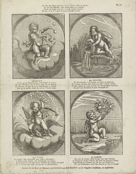 Curator: This engraving, made before 1767 by Cornelis van Noorde, is held here at the Rijksmuseum and is known by a few different titles, including "A Woman Offering Her Heart" and "Christ Protecting Against Evil". At first glance, how does it strike you? Editor: There's an almost…storybook quality to it. Stark contrasts in tone within each panel create a rather theatrical feel. Are we looking at some kind of allegory or moral tale told across these four scenes? Curator: Indeed. It's strongly allegorical, common for Baroque prints like this. Look how it presents a narrative journey through the landscape – in the first panel, we have a woman kneeling and holding her heart up to heaven. We then see Christ facing an attacker in the second, etc. Editor: Note the meticulous execution of the figures—very sharp details on a reduced scale— and look at that expressive use of line to give such dramatic tonal contrasts across the grid, achieving quite painterly textures using only simple engraved lines! Curator: The social role of imagery such as this would've been didactic; intended to be easily digestible, offering spiritual guidance, for example to a wide, non-specialized audience in an era before mass literacy and the mass proliferation of religious imagery. Editor: It is interesting that it reminds me of the grid or series so common in comics or even weaving designs. Think of the artist carefully plotting out his individual engravings, and how that would be part of a larger production or commissioned artwork… Curator: Precisely. It underscores your point about craft; such an engraving would have been replicated, passed around in print form for wide circulation, and this gives the work an undeniable and fascinating social role beyond a simply “devotional” context. Editor: To view these engravings is to contemplate the hours and craftwork it would have demanded and, I suppose, the human desire for a sense of the allegorical and beautiful, translated from the grand to the accessible. Curator: Absolutely. In essence, it provides an enlightening portal into the past’s cultural ethos and the ongoing allure of narrative expression.