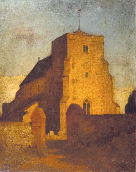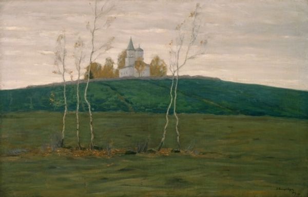 Editor: We're looking at Henri Rousseau's "Landscape" from 1886, an oil painting currently held in a private collection. The composition feels almost like a stage set, with these quaint houses lined up at the front. What strikes you most about its construction? Curator: Observe how Rousseau employs a rigid horizontal division of space. We have the houses in the foreground, a dense band of trees, then the buildings situated on a hill in the distance, and finally a large grey sky filling most of the frame. Note the flattening of perspective; each element exists almost independently. Do you notice how the texture is consistent throughout, defying naturalistic representation? Editor: Yes, it's like each section is carefully placed, not quite blending as a realistic landscape might. The colors too seem deliberately separate. How does this conscious arrangement impact your understanding? Curator: The formalized arrangement redirects us away from representational accuracy, guiding us instead to consider the intrinsic properties of each element. For instance, how does the simplified form of the buildings relate to the dark tangle of the branches? Are they balanced? Are they discordant? The painting creates its own internal logic. Editor: So, the meaning comes from analyzing these visual relationships rather than seeking an external narrative? Curator: Precisely. Meaning emerges from the structural interplay of line, color, and form. Rousseau isn't aiming for an imitation of nature, but an autonomous visual system. Editor: I see! Focusing on the structural relationships gives me a new perspective on Rousseau's intention. Curator: Indeed. It reminds us to analyze the work itself as an independent creation and resist looking elsewhere for facile narratives or symbolism.