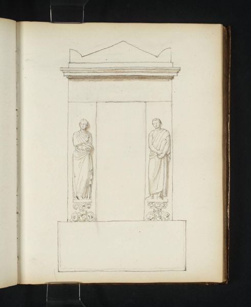 Editor: Here we have an untitled drawing by John Flaxman, housed at the Tate. It's a simple sketch of classical figures, very linear, but the book format makes me curious about its purpose. What's your take on it? Curator: Well, focusing on the material production, this likely wasn't intended as a finished art object. It's a sketch from a notebook, a record of Flaxman's thinking. The quick, unrefined lines speak to a process of exploration rather than a finalized composition. Editor: So, more about the act of creating than the creation itself? Curator: Precisely. It challenges the traditional notion of art as a polished commodity. We see the labor, the raw material of thought, before it's refined for consumption. Perhaps it’s a reflection of the artist's social context? Editor: I never considered the labor involved in a "simple" sketch. Thanks for the insight! Curator: And I appreciate your questioning of its context. It's all about layers of meaning and process.