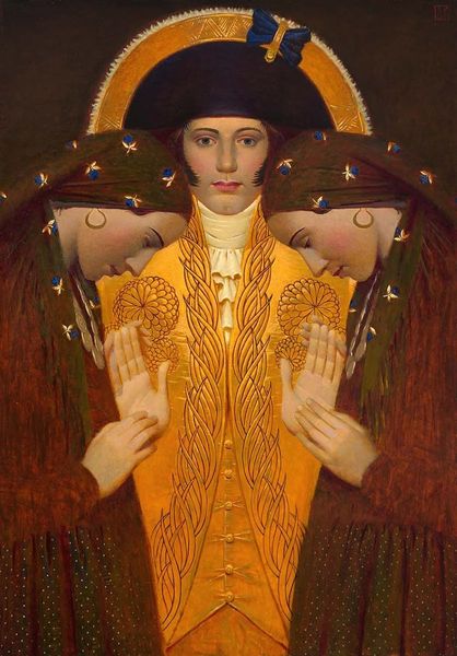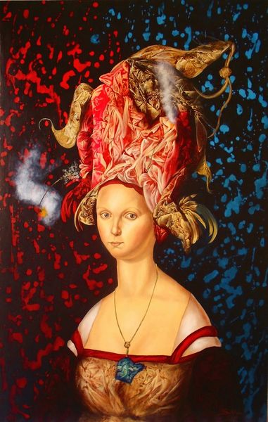 Curator: Welcome. Before us is "Battlefield," a 2019 painting by Andrey Remnev. Editor: The first thing I notice is the pervasive, slightly melancholic calm. The colors are muted, even pastel-like, creating a strangely serene battlefield scene. It’s more decorative than destructive. Curator: Indeed. Considering Remnev’s stylistic borrowing from medieval and academic art, the medium itself—the paint applied to canvas—becomes quite interesting. We see a deliberate flattening of perspective, echoing icon painting techniques, challenging our notions of representational depth. Editor: Absolutely. And look at the symbolism employed! We have a woman centrally placed. Perhaps she represents a nation or the archetypal mother figure threatened by war. Her placid expression invites a wealth of interpretations. Are these external, or internal battles she faces? Curator: I see your point. If we look closely, the repeating floral pattern in the background reminds us of decorative arts traditions, further blurring lines between fine art and craft. Think of the material production itself—the labor of creating repeating designs to enhance an object or artwork’s narrative… Editor: While you emphasize material making, I lean towards considering how such patterns operate psychologically. Note how the recurring motif creates a dreamlike backdrop. Combined with soldiers and weaponry, there is something deeply unsettling about this jumbled sense of history. Are we to consider how war affects femininity, love, beauty? Curator: A provocative observation, to be sure. To further add, one also wonders at how Remnev challenges traditional hierarchies between female portraiture and battlefield painting. He encourages reevaluation of the subjects deemed worthy of artistic representation… and investment. Editor: Yes, her ambiguousness only adds power. The woman acts as a lens through which to view both military actions and their reverberations, inviting meditation on their symbolic and literal battles. Curator: Contemplating Remnev’s fusion of medieval styles with his contemporary practice allows appreciation for the historical evolution and labor inherent in artistic representation. Editor: It's a haunting piece that forces one to consider the emotional, cultural, and timeless struggle surrounding the cost of war. Curator: It's been a pleasure reexamining assumptions surrounding art's history through this intriguing intersection. Editor: Agreed. A rich symbolic landscape offering more with each contemplative pass.
