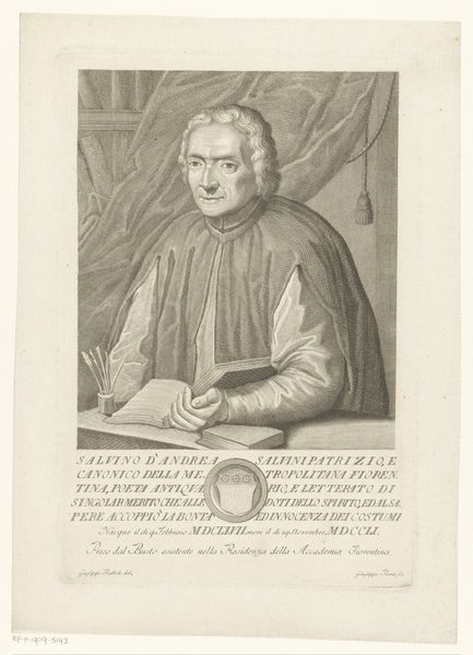 Curator: This print from 1747 is titled "Portrait of Cardinal Angelo Maria Quirini," by Carlo Orsolini. The print shows Quirini holding a book next to a parapet, framed in a cartouche with angels at the bottom, as well as a draped curtain, a tassel, and Latin text. What strikes you initially? Editor: The pervasive stillness and the monochromatic palette lends it a sense of dignified solemnity. Note how the linear precision creates a meticulous representation and emphasizes his high status and authority through symbolic objects like the book and the robes. Curator: Precisely. Quirini was a prominent figure in the 18th century—a cardinal, scholar, and librarian of the Vatican. The engraving functions as a piece of visual rhetoric, asserting his accomplishments through symbolism, for example through the library rendered on the backdrop to highlight his erudition and devotion to scholarship. Editor: Yes, and the composition reinforces that; his direct gaze and subtle smile is immediately captivating. The balanced arrangement between text and portrait and architectural features of the composition invite viewers to examine him closely, from his features to the smallest engraved line. This directs one's gaze, encouraging engagement with not just the representation, but also his persona. Curator: This portrait was commissioned as a public commemoration after his numerous contributions to the city, including the establishment of a library. The inscription in the cartouche underscores this, further solidifying his legacy through public acknowledgment and remembrance. Editor: It seems intended to convey both his personal attributes and institutional power. The formality inherent to engravings speaks to its role as a promotional piece as well. It certainly lends this Baroque print the quality of timelessness and grandeur that continues to resonate. Curator: Absolutely. In the end, viewing it with attention, we see Orsolini successfully captures the Cardinal in this time, forever enshrining his contributions in collective memory and reinforcing both secular and ecclesiastical power through symbolic portraiture. Editor: It's fascinating how studying this portrait reveals layers of meaning, blending historical context and aesthetic design, all contributing to a rich viewing experience.