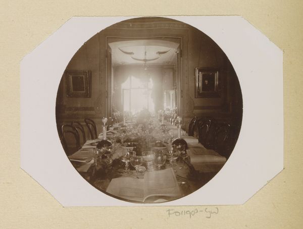 Curator: Welcome. We're looking at "Interieur met gedekte tafel," a photograph taken by Willem Frederik Piek Jr., likely between 1889 and 1893. What strikes you first? Editor: There's an almost ghostly quality. The room, rendered in sepia tones, feels like a memory fading. The details, while present, seem obscured. It’s definitely not a celebration of craftsmanship. Curator: I see what you mean about the ethereal quality, particularly created through the manipulation of the wet plate process, a very interesting trend at the time that sought to show, in artistic photograph, a domestic setting in Dutch high society. The careful staging speaks volumes about late 19th-century societal rituals. Editor: I find myself focusing on the materials, though. The table linens, presumably fine damask, the silverware…all the trappings of wealth and consumption. But the image isn't clear; instead the image looks more to showcase all of the goods for this social setting. The setting then dictates what can exist in society and who will get access. Curator: Absolutely, this speaks to a certain class. And remember, photography itself was still a developing medium, grappling with its role in representing reality. Editor: True. Consider the labor involved. Think about the labor required to grow the food, weave the linens, polish the silver... none of that is rendered with particular care. I wonder about who is invited. Curator: And the fact it is carefully composed means that there is a degree of privilege on the artist side; Piek decides what part of the world he is showcasing. He could not care as much as people involved in all processes. This brings me to your observation. The artist then is showcasing what the people could acquire in his world, in his period. The question of the access has always been there, but, even nowadays, is still very urgent. Editor: So it shows a closed social dynamic? Curator: That's how I would look into the history behind. Thanks to our reflection on the artwork, there's even much more things to learn.