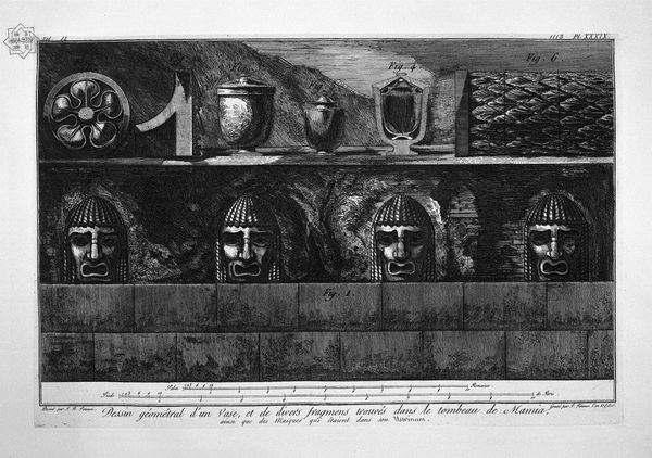 Giovanni Battista Piranesi created this etching, "View of the underground foundation of the Mausoleum of Adrian’s helium," using a technique that emphasizes stark contrasts of light and shadow. The composition is dominated by the strong, curved lines of the mausoleum's foundation, which create a powerful sense of depth and enclosure. Piranesi uses the contrast between the rough texture of the ancient stones and the smooth, geometric precision of the architectural design to highlight the tension between nature and order. The dark voids and the play of light across the surfaces add to the overall feeling of mystery. Piranesi's focus on the underground foundation evokes ideas about the hidden structures that support power and history. The semiotic weight of the architectural forms suggests themes of decay and the impermanence of human achievements. The etching is not merely a depiction of a ruin but a commentary on the cultural codes embedded in architecture. Notice how the formal elements contribute to a discourse on history, power, and the enduring legacy of Roman civilization.