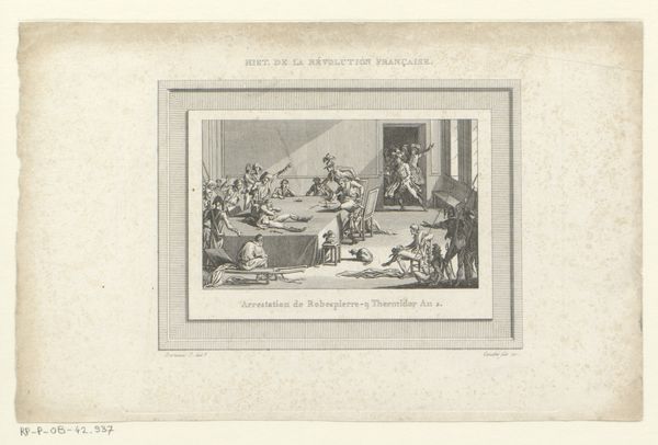 Editor: This is an engraving by Léopold Flameng, titled "Molière op audiëntie bij Lodewijk XIV" from 1859. It's fascinating how much detail he achieves with just ink on paper. It feels quite staged, a formal royal portrait. What strikes you most about this piece? Curator: Well, for me, it's all about the power dynamics being depicted. We have Molière, the celebrated playwright, presented before Louis XIV. But consider the *context*. Flameng created this print in the 19th century, long after both figures were gone. So, it’s not just a historical record. It’s a *representation* of how the French viewed their cultural icons and their relationship with power, after, notably, a revolution. Editor: That's interesting, I hadn't thought about the later date of creation. How does the setting contribute to this representation? Curator: Notice how Louis XIV is positioned: enthroned, elevated, almost unapproachable. But the very *idea* of a playwright like Molière, a commoner, even being granted this audience challenges the strict social hierarchies of the time. The print, created during a period of burgeoning republican sentiment in France, hints at a kind of cultural meritocracy that perhaps wasn’t fully realized in the 17th century but was definitely a point of national interest in the 19th. Do you see any visual cues that might emphasize that point? Editor: Maybe the fact that Molière is standing quite confidently, not groveling or appearing intimidated. It's like Flameng is imagining a more equal exchange, even in this unequal setting. Curator: Precisely. It highlights how art serves not just to reflect the past, but also to shape our understanding of it and subtly comment on the present. Editor: That makes so much sense. I see it now – the artwork as a commentary on history, filtered through a later socio-political lens. Curator: Exactly. History isn't static, and neither is art about history. They are both always being re-evaluated.