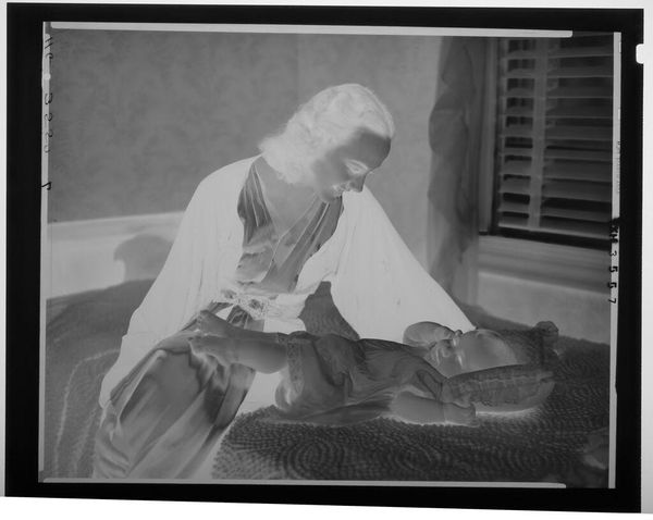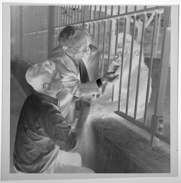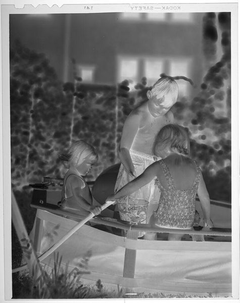 Curator: This small, untitled photograph by Jack Gould depicts a man tending his garden. The image is only 6 by 6 centimeters. Editor: My first impression is of quiet domesticity. The inverted tones lend an almost surreal quality to the everyday scene. Curator: Exactly. I’m drawn to the implicit narrative of suburban life and labor. What materials and processes are we seeing here, how does the very act of gardening become a social performance? Editor: And I see the image through the lens of post-war American idealism, the rise of suburbia, and the performative aspect of leisure. The image feels staged, doesn't it? Curator: Perhaps, but consider the material realities of maintaining this image, the hoses, the manicured lawn—it all speaks to an environmental impact beyond this small frame. Editor: It also raises questions about who is included and excluded from this idealized vision. It's fascinating how such a small image can hold so much social weight. Curator: Agreed, it prompts us to consider the broader systems at play in shaping our world. Editor: Indeed. This image certainly makes you think about the politics of the everyday.