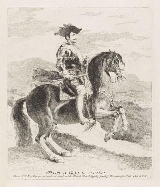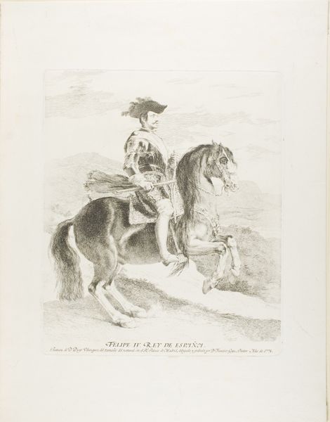 This print, *Filip IV, konge af Spanien, til hest*, was made by Francisco de Goya, and the inscription tells us that it was etched after a painting by Diego Velázquez, copying it 'from nature' in the Royal Palace of Madrid. The process of etching involves applying a waxy ground to a metal plate, scratching an image into it with a needle, and then immersing the plate in acid. The acid bites away the exposed metal, creating lines that hold ink. It's a relatively indirect process, demanding planning and skill to control the depth and quality of the lines. Consider the labor involved; not just Goya’s, but also the craftsmen who prepared the copperplate, ground it, and so on. Think, too, of the many impressions that could be taken from a single plate: etching was a reproductive technology, like photography today, and one that allowed Goya to disseminate an image of Spanish royalty. This wasn't just about replicating an image; it was about democratizing access to it. By understanding the processes involved, we begin to see how the artist acts as a conduit between the circles of royal power, artistic skill, and public consumption.