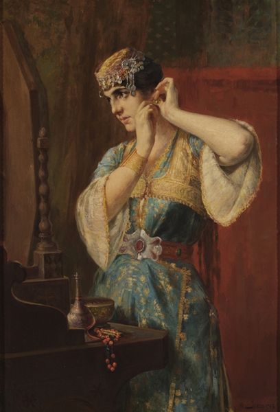 Editor: This is "Turkish Woman at her Embroidery Frame," painted by Jean Baptiste Vanmour around 1720 to 1737, using oil paints. It strikes me as an intimate glimpse into a very different culture, with such a focus on textiles. What draws your attention most about this piece? Curator: I find the representation of labor fascinating, specifically in how the painting highlights the materials and the *means* of production of embroidery. The canvas itself, the threads, the frame—they all speak to the material reality behind the image of oriental luxury that’s often portrayed in paintings of this era. Editor: So you’re saying the painting is more about the *making* than the woman herself? Curator: Not exclusively, but certainly, Vanmour brings our attention to the labor and skill involved. Consider how the artist has meticulously depicted the threads and the patterns of the embroidery frame. He’s showcasing not only the final product but the process and the materials employed. Where do these materials come from? Who has access to the embroidered product? The answers will likely involve international trade routes and specific class structures. Editor: I see! It’s interesting to think about the broader economic and social context implied by something that seems so decorative and simple at first glance. Does this connect to the "Orientalism" style at all? Curator: Precisely. Paintings like this were commodities themselves, traded and consumed within specific European social strata. So the act of painting, and the image itself, participate in that circuit of material exchange and cultural consumption. Where do you think that knowledge changes our interpretation of this artwork? Editor: I realize that, what appeared like a quaint snapshot now points to much larger issues of trade, labor, and representation. That adds layers of meaning that I hadn’t considered before. Thank you! Curator: Absolutely. Seeing art through a materialist lens opens up new pathways for understanding the intricate relationship between aesthetics and the wider world.