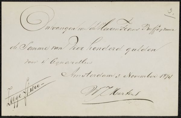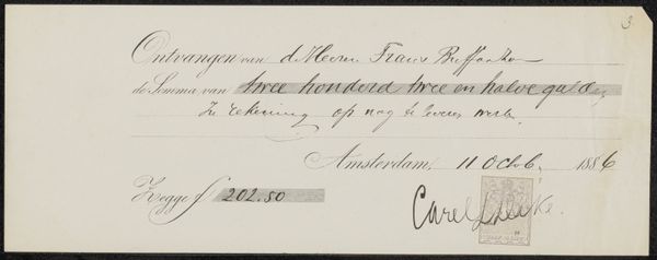 Curator: This is a receipt, "Kwitantie voor Thérèse Schwartze," potentially from 1881, currently residing here at the Rijksmuseum. It's an intriguing little thing isn't it? Mostly ink on paper. Editor: My initial impression is one of quiet formality, a dance of commerce rendered almost elegant by the looping script. It feels like a whispered transaction from a bygone era. Curator: Absolutely. This receipt speaks volumes about the financial dynamics of the art world. It shows a payment made to the artist Thérèse Schwartze by Frans Buffa and Zonen. This reveals the artist's professional dealings. Editor: One wonders what "Schildery voorstellinas" represents, the very artwork for which she was paid. Perhaps something depicting light and darkness, as suggested by the mention of "luster" and "browser"? The details, or lack thereof, tantalize the imagination. Curator: The materials themselves—ink, paper, typography—also highlight the commodification of art. Even the very documents related to transactions gain aesthetic value over time and end up displayed. Think about the value we give art versus daily mundane objects. Editor: It's a potent reminder of art's intrinsic relationship with capital. Beyond its aesthetic qualities, the art becomes a tradeable commodity. Curator: Indeed, these artists relied on these very receipts! Each stroke of the pen, and printed text, signifies labor, trade, and survival. Editor: A beautiful document hinting to hidden meanings! Looking closer at the flourish of her signature, there’s a delicate rebellion. Schwartze made her mark and has lasting presence in this exchange. Curator: Yes, Schwartze, although working in a traditionally male-dominated field. Her signature here, etched on this financial document, signifies her agency and recognition in that field. Editor: Exactly. It feels like a peek behind the curtain, beyond gallery walls, at art as both a source of passion and a livelihood. Curator: Thank you for these amazing thoughts! Considering this, and the insights you shared, what at first appeared mundane has taken on significant meaning. Editor: Indeed. It has been fun! I was captivated by the narrative that hides beneath the formalities and commercial exchanges within these elegant inscriptions!
