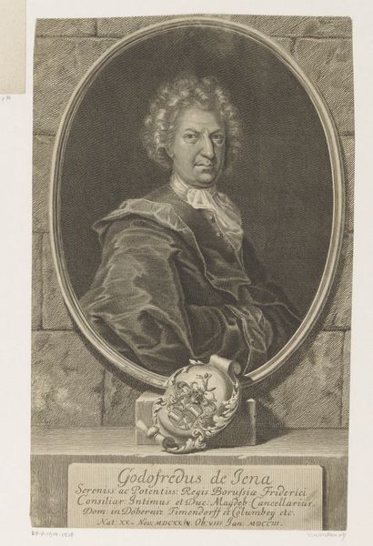 Curator: Ah, what a stern fellow. There's something quite formidable about the set of his jaw, don't you think? Editor: Indeed. What we have here is "Portret van Johann Balthasar Gullmann," a baroque print by Marc Christoph Steudner, likely created between 1697 and 1704. It's an engraving. Curator: An engraving… the light seems to come from everywhere and nowhere at once. See how it caresses the folds of his… cloak, is it? And those frilly cuffs! Oh, to live in a time when men wore such theatrical accessories. It all speaks of privilege, doesn’t it? Editor: Absolutely. The clothing signals status and belonging. But also, let's consider Gullmann himself—his titles suggest someone deeply entrenched in the religious, political, and economic power structures of his time. The historical context would have definitely emphasized this rigid social hierarchy. The visual markers of status were carefully curated and communicated messages of power and influence. Curator: And the setting! He stands before… well, some vaguely arboreal scene. Is it meant to convey a connection to nature, or simply to add depth? Maybe suggest his estates, his lands? I suppose everyone needs a backdrop. Although, truth be told, the guy looks as if he is ready to either scold you or ask you about some complicated trade deal. Editor: That backdrop does serve a purpose. Positioning him against that landscape underscores his dominion and belonging. Think about how wealth at the time was inherently tied to land. So, the engraving does more than immortalize a face—it preserves and promotes a whole value system. His gaze is equally interesting to analyze. It is carefully calibrated. There’s calculation behind it. Curator: It does feel incredibly strategic, doesn’t it? It's interesting how much we assume, projecting intentions and motivations onto this two-dimensional figure frozen in time. Almost like we're piecing together a personality from fragments. But still, he really wouldn't fit in our local coffee shop today! Editor: And hopefully today, we also analyze more critically the societal structures that enabled figures like him to amass and wield so much power. The details in artworks like these really invite discussions of representation, class, and historical memory. Curator: Well, next time I encounter a scowling portrait, I’ll be sure to imagine what values lie beneath all that formal attire and that perfectly arranged backdrop. It certainly gives one plenty to consider!