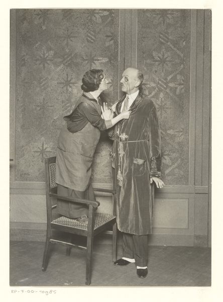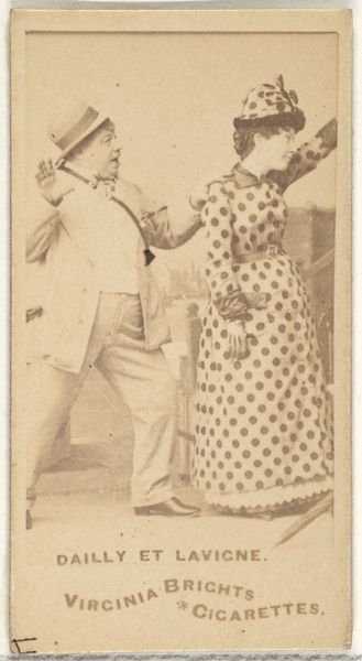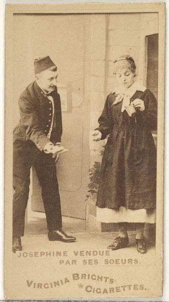 Curator: Let’s consider this rather theatrical portrait of Jane Hading. Part of a series, “Actors and Actresses,” it was produced between 1885 and 1891 by Allen & Ginter as a promotional card for Virginia Brights Cigarettes, and it’s now housed at the Met. Editor: It strikes me as a tableau of high drama – melodramatic, almost. She’s seated, head in hand, a figure looming over her with an accusatory point. It’s charged. Curator: Precisely! This was during the Belle Époque, a time of burgeoning theater culture. Allen & Ginter shrewdly capitalized on celebrity. These cards were inserted into cigarette packs, encouraging brand loyalty through a fascination with fame. Editor: And, more specifically, appealing to certain conceptions of idealized womanhood and femininity. Note how her gesture almost obscures her face. What’s she meant to represent: remorse, guilt, shame? What societal constraints dictated a female actor’s performance and representation, on and off the stage? Curator: I find it equally revealing to consider the dynamics between commercialism and artistry. On the one hand, you have this ephemeral object—a cigarette card meant to be collected. On the other hand, you have an implicit claim about consumer habits, social status and leisure time in Europe. Editor: Absolutely. It speaks volumes about the way social currency and the emerging power of advertising intersected to elevate actors, primarily stage actors, and normalize smoking at once. Curator: So this photograph operates not merely as a picture, but as a carefully manufactured form of cultural capital during an era of profound social shifts. Editor: Indeed. By understanding that interrelation between art, representation, performance and power, we may glean deeper insight not just on Ms. Hading herself, but about late 19th century gender, consumerism, and identity at large. Curator: I am very glad we have spent time with this image! Editor: As am I. It offers a potent vignette.
