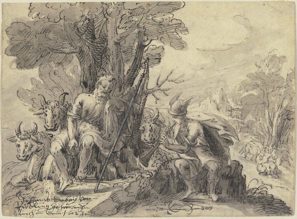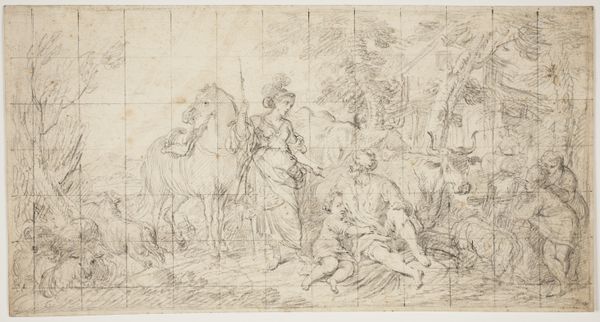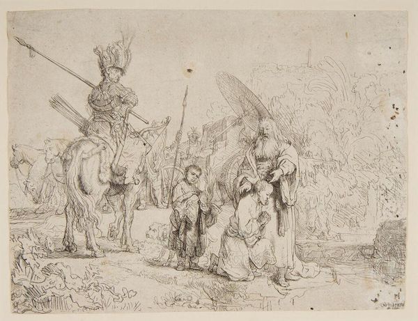 Curator: The sense of profound quiet captured in this drawing, Rembrandt van Rijn's "The Baptism of the Eunuch" from 1641, really strikes me. It's just pencil and ink on paper, yet so full of contained emotion. Editor: The first thing that stands out to me is how much dynamic activity and commotion Rembrandt manages to evoke with a few simple strokes. Curator: The artwork represents a key episode from the Acts of the Apostles. It depicts Philip baptizing an Ethiopian eunuch after he converted to Christianity. Its narrative-art and history-painting elements are so moving! Editor: Agreed, and structurally, the placement of figures and shading creates a real sense of depth, pulling the eye through the scene, especially if we consider that it’s made using very sparse, almost frantic strokes. Curator: It does. Rembrandt’s interpretation really highlights the universality of the Christian message, its ability to transcend geographical and cultural boundaries. In that context, the historical backdrop is extremely crucial! Editor: And there is some very precise line work at play! Look at the soft but clearly delineated features on the faces; also, Rembrandt masterfully renders different textures and materials. The fabric of the eunuch’s clothes, for instance, compared to the sleek coat of the horse… superb. Curator: Absolutely. Rembrandt made this work during the Dutch Golden Age. This period of great social change certainly left a mark on his production, opening to increasingly diverse social influences and exchanges. Editor: All true! Though when focusing on form, I can’t stop thinking about the contrast. You've got that incredibly intricate detail in the foreground juxtaposed against this blurred, suggested background. It almost gives the scene a dreamlike, ephemeral quality. Curator: Understanding the sociopolitical atmosphere in which an artist like Rembrandt operates gives a unique perspective into interpreting these pictorial components. Editor: I think we can safely say that this tiny artwork rewards extended, in-depth study, because every formal choice seems deliberate and full of meaningful implications. Curator: I'm struck, again, by its portrayal of this particular biblical event as one shaped by very human, very relatable needs and circumstances. Editor: Indeed. Looking beyond narrative considerations, there's such brilliance in Rembrandt’s compositional control and line variation.