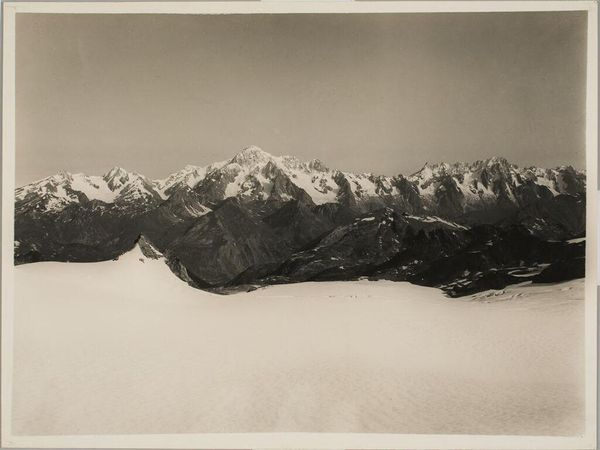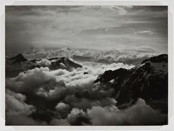 Curator: Vittorio Sella's photographic print, "Ushba, from the Suanetta in the Caucasus" presents us with a stark, arresting landscape. Editor: Wow, it's like looking into a dream, or maybe a half-remembered myth. The way the clouds curl around the peaks gives it this incredibly romantic, almost haunting feel. Curator: Precisely. Sella’s masterful use of monochrome not only emphasizes the sublime geometry of the mountain, but also creates a study in contrasts. Note how light and shadow define its form. Editor: Right! It's like the mountain is pushing through the darkness, or maybe hiding within it. I love that tension. It kind of echoes the climb, doesn't it? Curator: An apt observation. Sella captures Ushba's imposing stature through compositional choices that underscore its formidable presence. Editor: Yeah, you can practically feel the bite of the wind and the crunch of the snow. It's a testament to the power of landscape, really. Curator: Indeed, an engagement with the dialectic between the mountain's grandeur and our perception. Editor: Well, I'm ready to pack my bags and go climb it, or at least write a poem about it. What a vision!