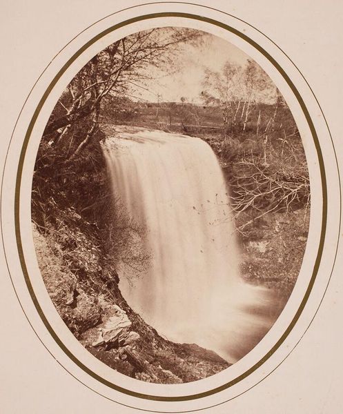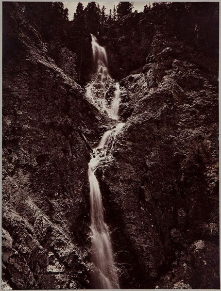 Curator: This is John Adams Whipple's "Chrystal Cascade." There's no date associated with it, but Whipple was an active photographer from the mid-19th century. Editor: It feels like peering into a secret world! The cascading water, almost blurred, contrasts beautifully with the sharp, rocky edges. Curator: Whipple masterfully uses light and shadow. Water, often a symbol of purification and renewal, courses through the rugged landscape. What meaning do you find in this, especially framed as such? Editor: I see something like resilience here. The waterfall becomes a symbol of relentless force cutting through and shaping even the most formidable stone, but with a gentleness, like a whisper. Curator: It's true; the scene balances power and tranquility. The photograph captures a moment of both raw energy and quiet contemplation. It's a paradox, isn't it? Editor: Yes! An enduring symbol of nature's power, captured in a way that feels surprisingly intimate.