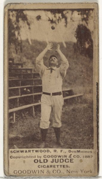 Editor: This is “Pinkney, 3rd Base, Brooklyn,” a print made sometime between 1887 and 1890 by Goodwin & Company as part of the Old Judge Cigarettes series. It feels like a very early example of sports photography and advertising combined, capturing a posed action shot. What stands out to you in this image? Curator: What immediately strikes me is the image's context as a collectible card inserted in cigarette packs. This was a deliberate attempt to market cigarettes through popular culture. Sport, and baseball in particular, had become increasingly important in the social fabric of the late 19th century, particularly amongst working-class men. Editor: So, the card becomes a kind of social mirror, reflecting and shaping popular values? Curator: Precisely. The inclusion of Pinkney, posed and almost heroic, links him and by extension baseball, with the aspirational values projected by the advertisement. Notice, however, the implicit promotion of tobacco, subtly embedding this consumption habit into everyday leisure. In doing so, baseball, and other similar trends were heavily influenced by commercial agendas and became symbols tied to wider societal power dynamics. Editor: It’s strange to think about how such everyday objects were actively participating in constructing this narrative. Curator: Exactly! They helped establish cultural values and promote particular behaviors under the guise of casual admiration for sports and its icons. Editor: I had never thought about advertisement as such a forceful medium. Thanks for explaining. Curator: My pleasure! Thinking about the social forces at play always opens new layers in our understanding of art.