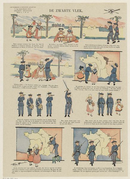 This print titled 'Oude kleeren' which translates to 'Old clothes' by Michelet, presents a series of sequential images that tell a story. It's fascinating to consider the history and culture that would have given rise to such a narrative. The story unfolds with an exchange of old clothes for money, followed by a darker twist: soldiers intervening, not to uphold justice, but to steal from the thief. The sequential format of the piece is reminiscent of early comics, which provided a way for complex narratives to reach a broad audience. The artwork uses traditional representations to delve into themes of morality and social injustice. The emotional journey of the figure as he transitions from hopeful to robbed mirrors the vulnerability experienced by many in a society rife with inequality. It's a stark reminder of how power dynamics can exploit the most vulnerable. The print ultimately serves as a poignant reflection on the human condition.