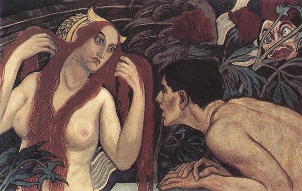 Kuzma Petrov-Vodkin made Youth (Kiss) using oil paint. There's a beautiful stillness in this painting. The figures are bathed in this warm, reddish light that feels both intimate and a little unsettling. Look at how he models their forms – it's not about perfect realism, but more about capturing the essence of the body, the weight of it, the way light moves across the skin. I'm drawn to the way their hands meet; it's tender but also a bit awkward. The artist uses these soft, blended strokes, especially in the flesh tones, which create this dreamlike quality. It reminds me a bit of Gauguin, actually, that same interest in the human form. But where Gauguin went for bold colours, Petrov-Vodkin uses a more muted, subtle palette, which gives the painting a more melancholic feel. Art is a conversation, right? Each artist building on what came before, twisting it, turning it into something new.