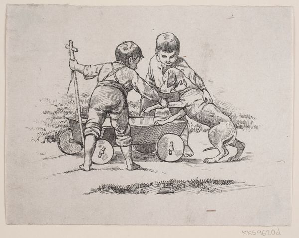 This is an illustration for a story, made by an anonymous artist using an unidentified printmaking technique. The image depicts two boys riding in a wagon pulled by another boy, with a dog as their passenger. The social conditions that shape artistic production can be seen here in the depiction of childhood and leisure, perhaps reflecting an era of increased attention to youth and recreation. The cultural references might include popular literature or imagery of the time, showing idealized scenes of boyhood. Without knowing the specific story this illustration accompanies, it's difficult to fully understand its meaning. But we can explore the historical context of childhood and leisure in the relevant time period. Historians often use sources like children's literature, educational materials, and social surveys to better understand the values and beliefs represented in such images. Ultimately, the meaning of this artwork is contingent on the social and institutional context in which it was created and received.