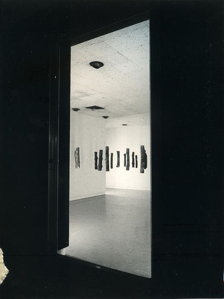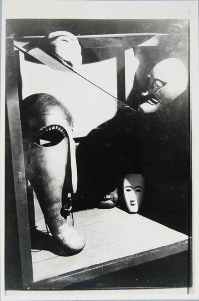 Editor: This copy print is called Bauhaus Stage Improvisation, by T. Lux Feininger. It’s quite striking. The stark lighting and shadowy figures create a sense of mystery. What sort of symbolic language do you see at play here? Curator: The figures cast long, distorted shadows, evoking a sense of unease. Notice how the geometric shapes of the screens interact with the organic forms of the bodies. Do you feel that contrast speaks to a tension between industrialization and humanity, common themes in Bauhaus art? Editor: I hadn't thought about it like that, but now I see how those simple forms create such a complex mood. It makes you wonder what stories these performers are trying to tell with their bodies and shadows. Curator: Precisely! The performance transcends a narrative. The visual interplay between light, shadow, and form creates a lasting impression. This is where the power of Feininger's iconography resides.