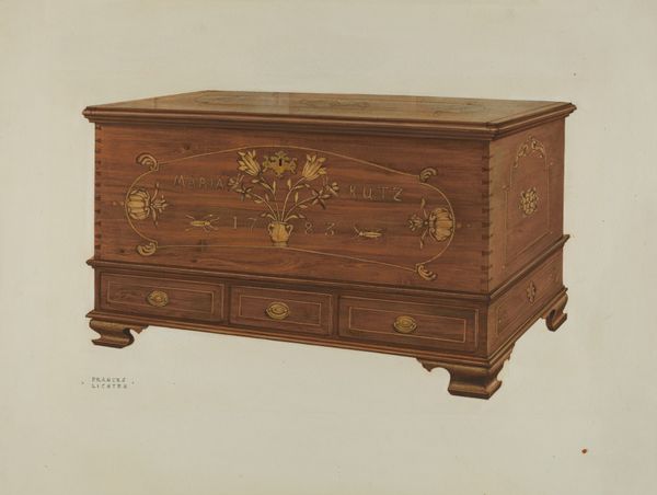 Frances Lichten’s watercolor drawing presents a Pennsylvania German dower chest, a potent symbol of heritage and domesticity. The chest is depicted in a straightforward manner; its rectangular form and flat planes emphasize its functional design. Lichten’s use of color, with muted reds and greens against the wood grain, creates a visual structure that balances naturalism and stylized ornamentation. The floral motifs are framed by column-like structures, suggesting a garden or architectural facade, which plays with ideas of nature and culture, private and public space. This piece destabilizes a simple reading by layering symbolic elements within a functional object. Ultimately, it's a visual study of how cultural values are embedded within the everyday. It invites us to consider how objects communicate complex narratives through careful composition and arrangement of decorative elements.