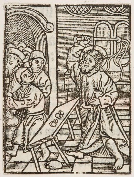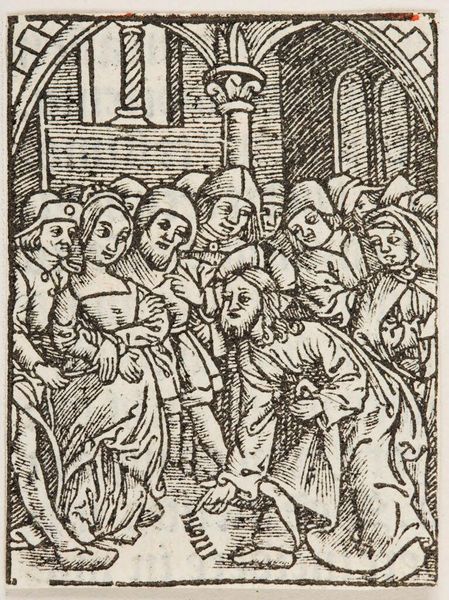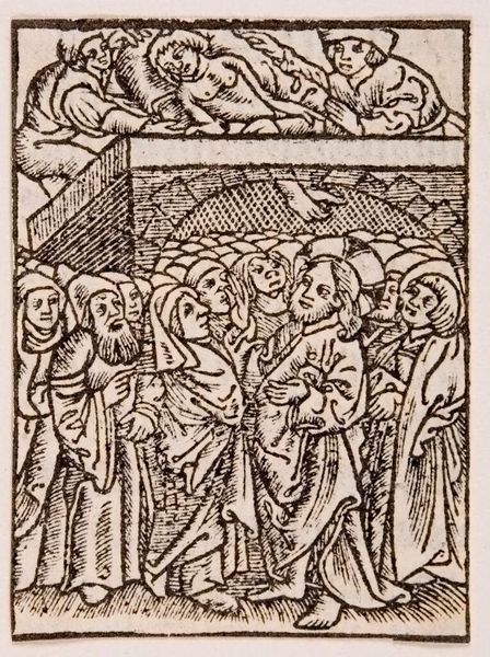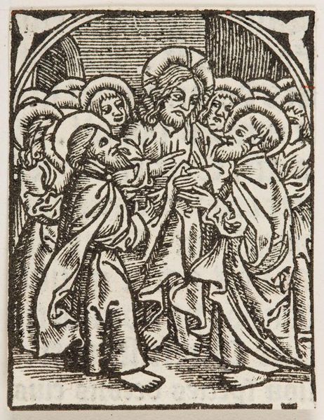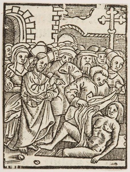 Editor: This woodcut, titled "Mission of the 12 apostles to cure, raise, cleanse, and cast out demons," presents a compelling scene. It appears to be early, given the somewhat crude lines. What can you tell us about its historical context and public role? Curator: This piece likely circulated widely due to its medium; woodcuts were relatively inexpensive to produce. How might this accessibility have affected its reception and impact on society at the time? Editor: Perhaps it served as a form of religious instruction for the masses, similar to stained glass in churches? Curator: Exactly. The repetitive imagery would have reinforced the Church's teachings, shaping public perception of faith and divine power. It's fascinating to consider its function as both art and propaganda. Editor: I never thought about it that way, that's a perspective shift. Thanks!