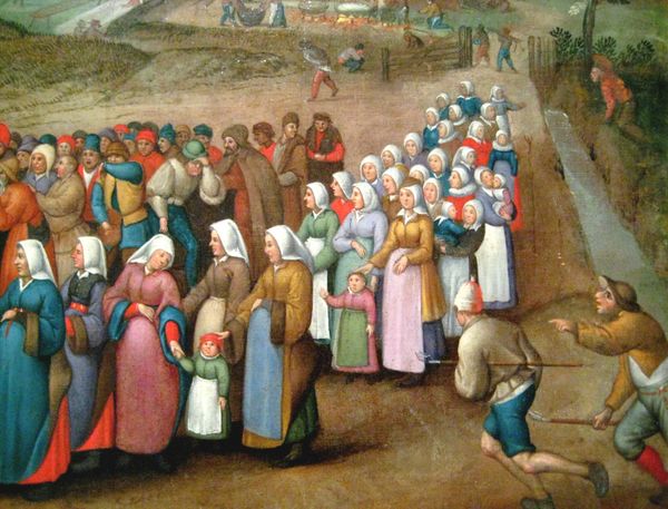 Curator: Looking at this cropped section from Gentile Bellini's "St. Mark Preaching in Alexandria," painted in 1507, I’m immediately struck by the geometry of the veils. Editor: Geometry is the word! The sheer volume of white, pyramidal forms dominates my perception. It’s almost dizzying, and unsettling. The individuals beneath seem to recede, secondary to this overwhelming field of white. Curator: Indeed. Consider that white, often seen as purity, is deployed here in a context of colonial encounter. These veiled figures symbolize more than simple piety, evoking an imposed uniformity—perhaps even erasure of identity under Venetian influence. Editor: The interplay between light and shadow within those veils does create an odd effect, like individual sculptures carved from light itself, although this particular slice gives very little clue to Bellini's masterly deployment of vibrant colors that are evident in the complete work. Curator: Yet, the repetition itself becomes significant, evoking both the collective conversion and a possible visual allusion to funerary shrouds. Could this uniformity suggest not just baptism, but a metaphorical death of their prior identities? Editor: That's quite compelling. Focusing solely on the construction, you notice how the sharp folds create movement despite their stillness. It is a very canny piece of image-making, as well as a narrative. Curator: This brings us back to your initial point about unease. Bellini skillfully uses formal elements to explore complex socio-political narratives of religious conversion and cultural domination within the visual space. Editor: Looking closer, one also gets a small sense of the individual faces beneath—each veiled figure offers a tiny glimpse of humanity which offsets the mass-effect of all those forms. Curator: Agreed. Ultimately, what strikes me is the power of Bellini’s rendering to make us question who controls meaning, especially through a reading of material objects and bodies caught between worlds. Editor: It does that remarkably, despite its somewhat incomplete and cropped character as a fragment, underscoring how even visual scraps possess narrative potential when closely decoded.