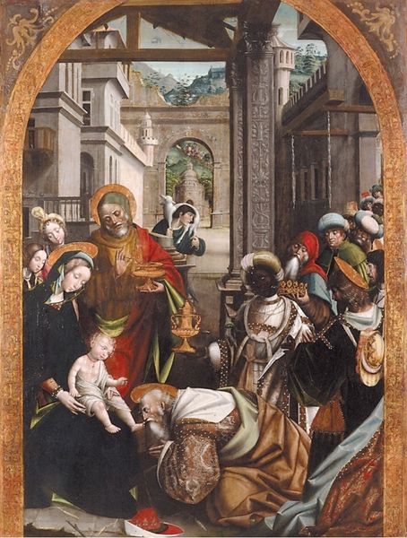 Editor: Here we have *The Presentation in the Temple*, by an anonymous artist. I’m immediately struck by how the artist uses such vibrant colors within the very structured architecture. How do you see this work interacting with the historical context? Curator: Well, it's like stepping into a beautifully illuminated manuscript, isn’t it? The painting, though anonymous, pulses with the anxieties and devotions of its time. Notice how the figures, while rendered with meticulous detail, seem almost to float within the architectural space. Perhaps a reflection of the delicate balance between the earthly and divine? Editor: That makes so much sense! I was so focused on the colors, I hadn't thought about the balance between the figures. Curator: It's a dance, isn't it? A dance of devotion, a dance of color, a dance of history...all caught in a single, breathless moment. Editor: It gives me a lot to think about, thanks.