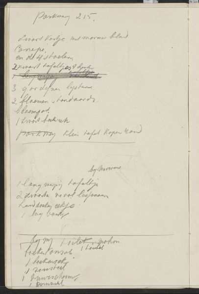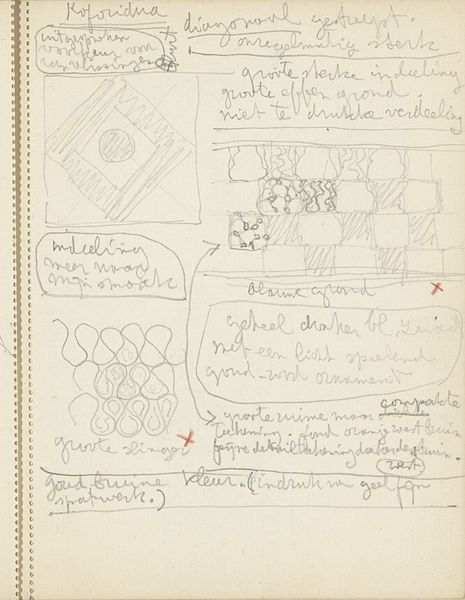 Editor: This is "Decorative Patterns" by Reijer Stolk, likely created sometime between 1916 and 1945. It's a pencil drawing on paper, and feels like a peek inside an artist's mind – almost stream of consciousness. There’s handwritten notes alongside geometric shapes, patterns, and color notations. How do you read a piece like this, with such varied information presented together? Curator: Well, consider this a document of artistic labor. What we see isn’t a finished “artwork” in the traditional sense, but rather evidence of Stolk’s process. Look at the materiality of the work. We see the immediate trace of the artist's hand through pencil marks. These are humble materials, indicative perhaps, of resource limitations given the probable time frame this piece was made, particularly amid war shortages. How do these elements affect your perception? Editor: It definitely humanizes the art-making. Seeing the calculations and material considerations removes some of the mystique. It almost feels more honest, more about problem-solving. Curator: Exactly. It blurs the boundaries between the "high art" of a finished painting and the functional nature of design or craft. It raises questions about the social role of art, where even preparatory sketches on paper reflect labor and resource management within a specific cultural context. The repetitive nature of patterns being designed brings the subject of production to the foreground. Editor: So, it's less about the aesthetic beauty and more about the means of creating something aesthetically pleasing, and the realities that come with that? Curator: Precisely. We're examining the tangible elements and understanding their connection to the artist's work. Does understanding this approach influence how you now see similar works? Editor: Absolutely. I'll be looking beyond just the finished image now, trying to find clues about the artistic process, the materials used, and the context it was all created in. Thank you for that perspective!
