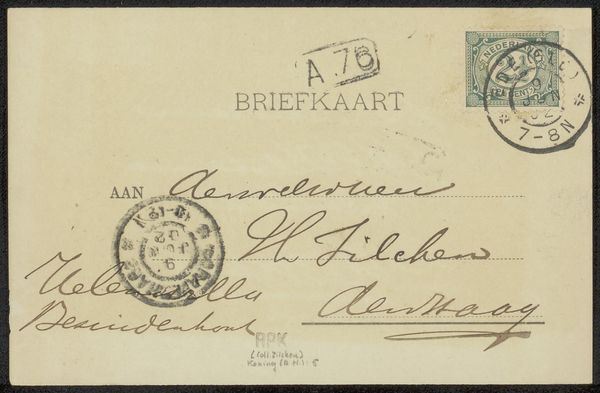 Curator: I see a quiet hum of correspondence in this small work. It's titled "Briefkaart aan Johan Philip van der Kellen," tentatively dated to 1895. Currently housed here at the Rijksmuseum, this piece, likely penned by Johan Philip Menger, invites us into a personal moment, delivered on humble paper with ink. What leaps out at you? Editor: The overwhelming sense of fragility, honestly. It's just a wisp of a thing, yet packed with the weight of human intention and the journey through time. The soft greys and creams whisper a story of delicate survival. Curator: Absolutely, and consider the artistry involved. We see skillful pen work composing the entire piece: calligraphy taking center stage. There’s an undeniable elegance in the looping script. It's interesting, too, how a purely functional document elevates itself almost to art through form and gesture. Editor: Yes, the handwriting becomes its own sort of composition—rhythm, balance, texture. Observe the placement of the stamp, for instance, its stark geometric order playing off against the fluidity of the handwriting. Even the postmarks, disruptive as they are, contribute layers of visual intrigue to the whole. The eye bounces across different graphical elements creating a visual harmony out of simple parts. Curator: I'm charmed by imagining the message itself. Is it a cordial invite? Business? And the address rendered by a loving hand, addressed with thought and care— the care of pen meeting paper seems utterly lost today, with emails buzzing at a second’s notice. Editor: Indeed. It's a poignant reminder of human connection outside the digital glare. One can appreciate how such personal, material details serve as a form of quiet resistance to impersonal interactions that have become typical today. Curator: So beautifully stated. As we linger here, let us cherish this humble "Briefkaart", acknowledging how an ordinary postal note serves a portal back to whispers from yesteryear. Editor: Absolutely. A reminder that even the simplest things can hold profound beauty.